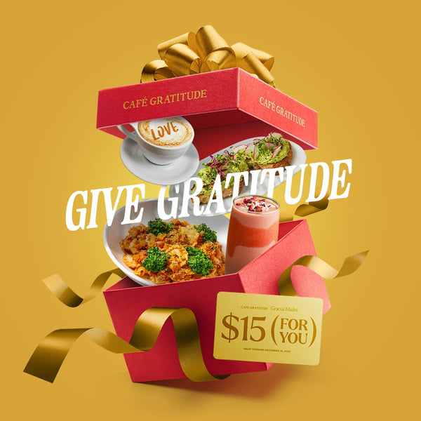 Welcome to our world where food is plentiful and gratitude is abundant. Since 2004, Cafe Gratitude has been passionately committed to creating a healthier, more vibrant world through plant-based eating, wellness, community and connection.